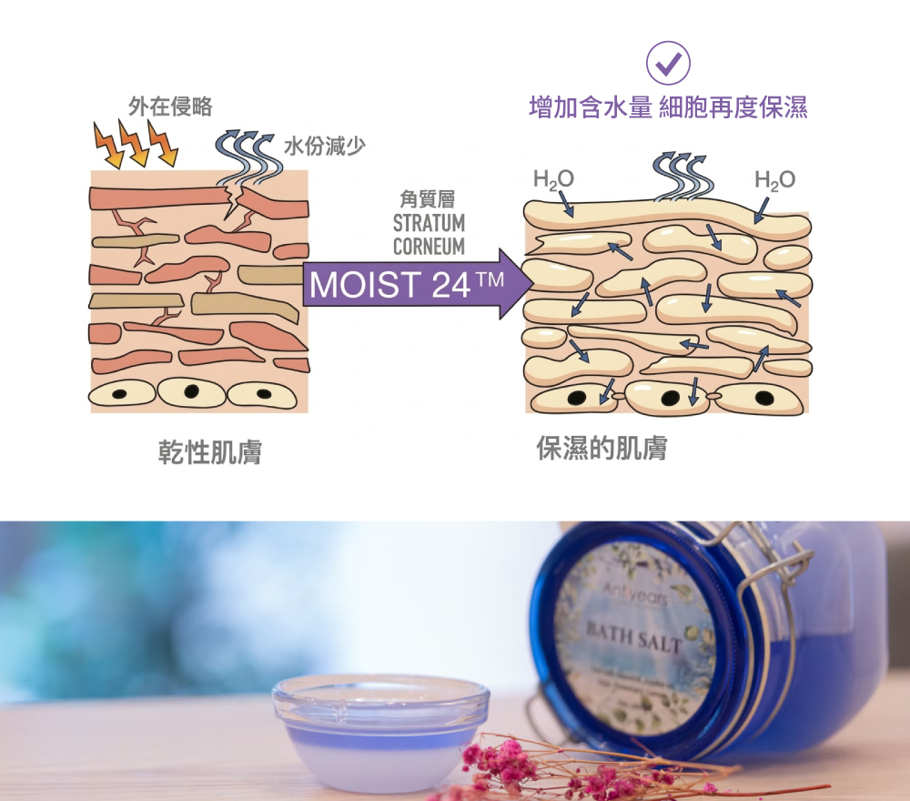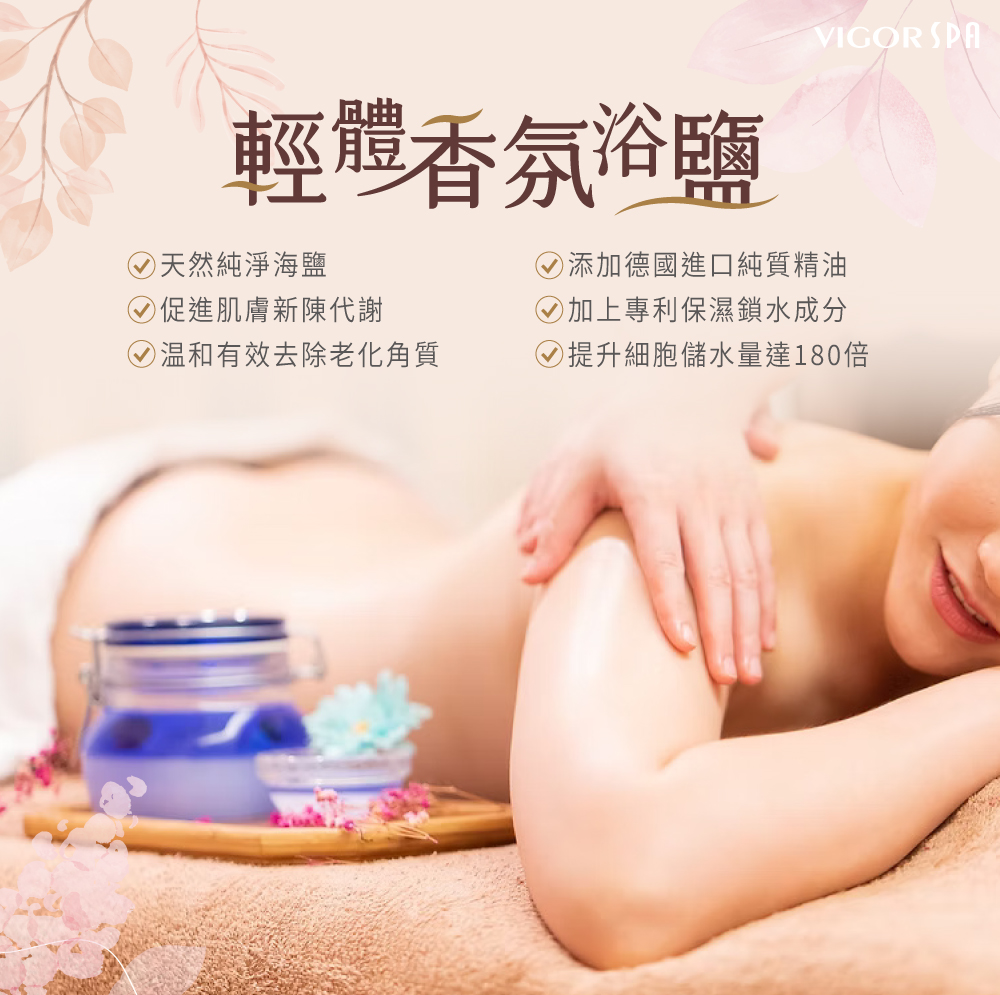 天然海鹽 ◆具有滲透壓作用,鉀、鈣、鎂等各種礦物質,有助於皮下血液及淋巴液的流動。 ◆配合按摩讓新陳代謝變更快,幫助流汗促進皮下脂肪燃燒。 ◆提高肌膚代謝率,加快黑色素排走,強化肌膚彈性,所含的蛋白質分解酵素能軟化老舊角質(污垢),去除毛孔及汗腺的舊皮脂及污垢,代謝體內毒素、廢物,淨化身、心、靈恢復自然平衡。 白茅萃液 ◆源自澳洲的沙漠植物,為高效保濕因子配方。 ◆含有高量的鉀離子保持滲透平衡,提升細胞儲水量達180倍,保濕效果長達24小時。